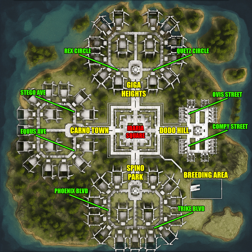 Desweiteren findest du in jedem Bezirk ein Bankterminal, einen Reward Vault, einen Transmitter sowie ein paar Verkaufstische vom Server.